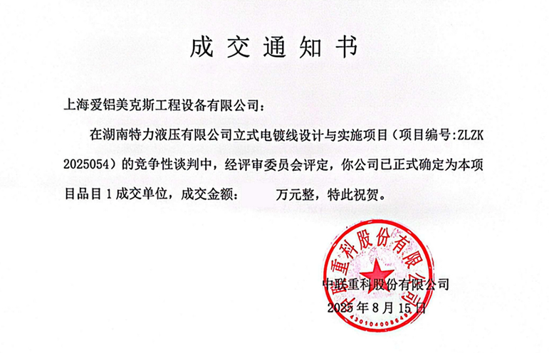 我司参与的湖南特力液压有限公司立式电镀线设计与实施项目招标,我司中标该项目的3.5米镍铬线、2米立式镀铬线、3米立式镀铬线。